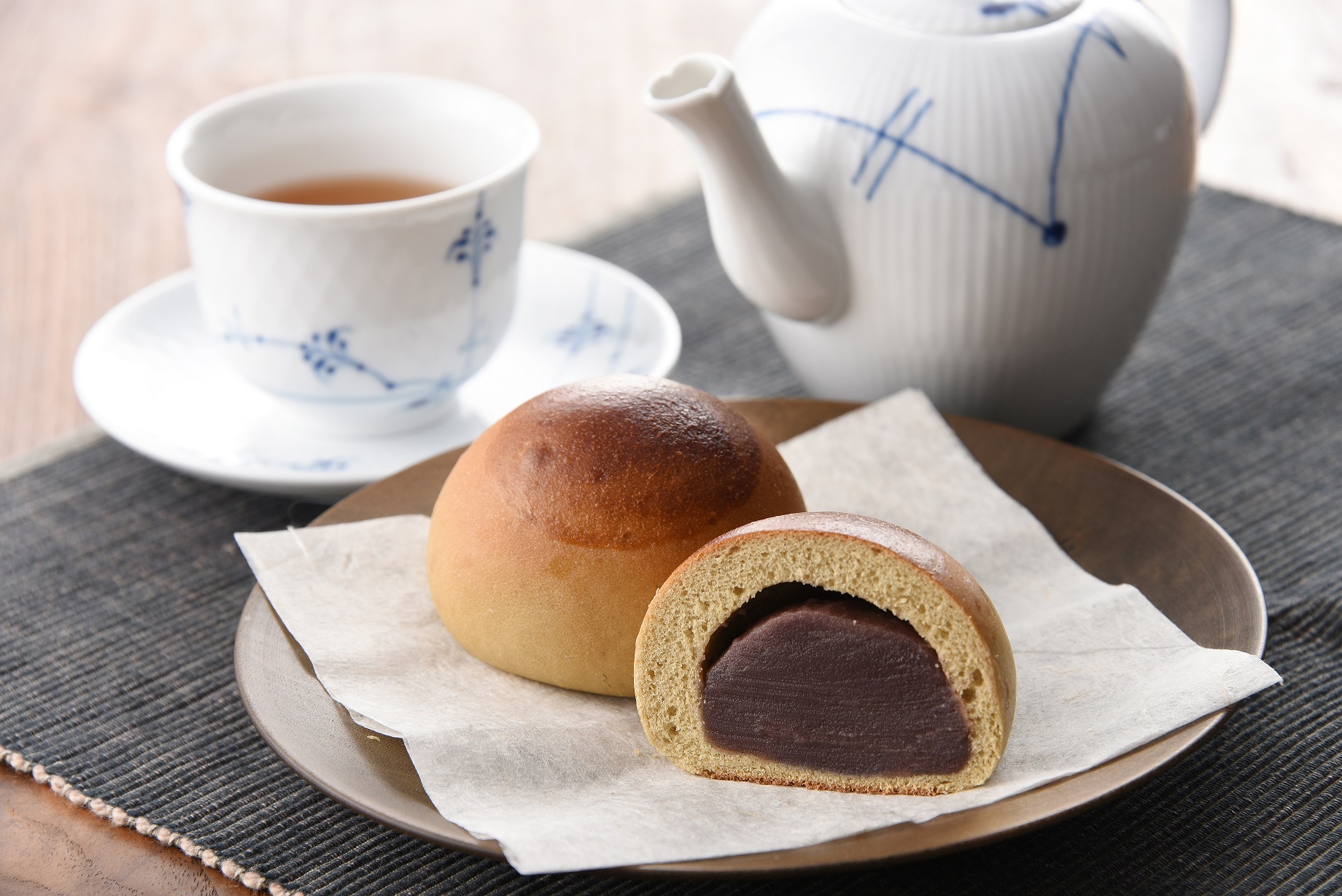 この「入城400年記念あんぱん」は、上田流和風堂様からご依頼をいただき、今年4月29日に縮景園で行われた茶摘み茶会のお茶菓子として提供させていただいた”ほうじ茶あんぱん”をアレンジしたものです。お茶会の茶菓子としてパンが提供されることは大変珍しく、参加された方からは驚きの声とともに、ご好評いただきました。抹茶との相性を考え、ほうじ茶の風味がしっかりと感じられる生地に、上品な甘さとなめらかな食感のこしあんを包み焼き上げた「入城400年記念あんぱん」。その包装袋には、上田家の家紋「釘抜き」を記させていただいています。