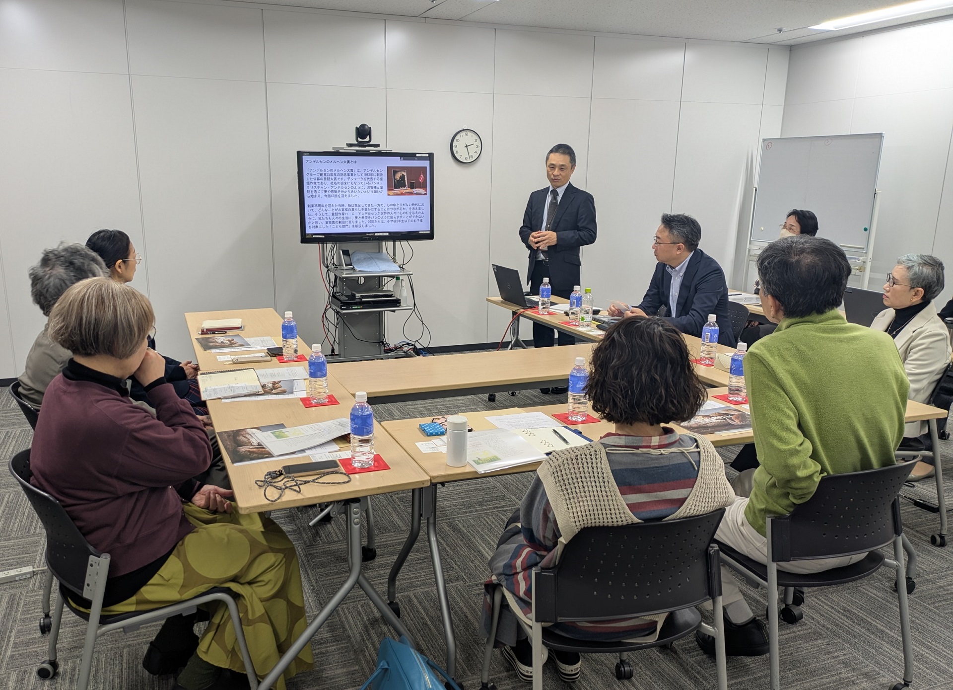 前半は、アンデルセングループについて、本賞の趣旨および選考作画に関する概要をご説明。後半は質疑応答を行い、活発な意見交換の場となりました。事務局からは「先生が絵を描きたいと思う物語をお選びください。文章とイラストの配置にとらわれず、描きたい絵を自由にお描きください」など選考作画についてお伝えすると、先生方は熱心に耳を傾けられていました。