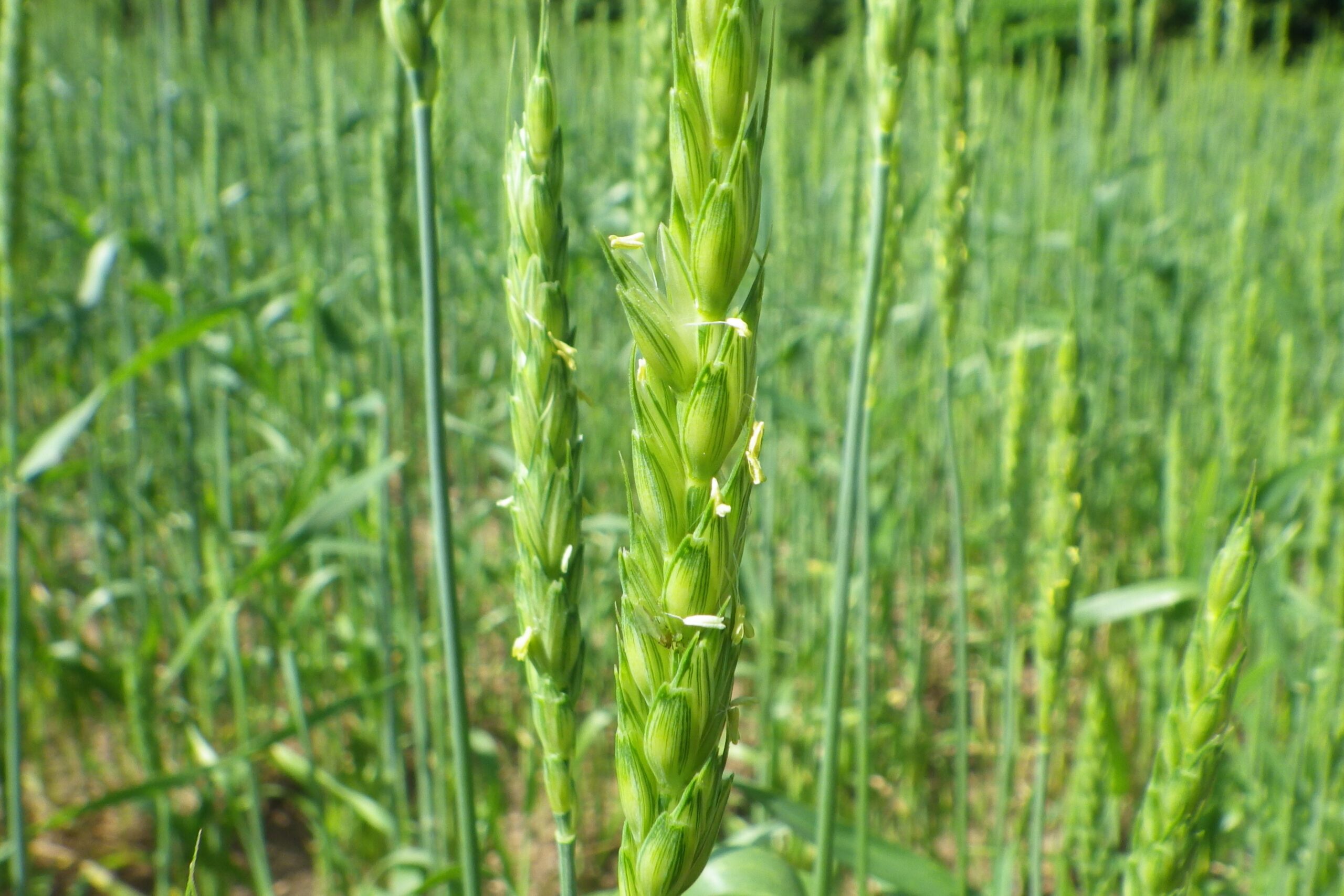 出穂から数日経つと、小麦の花が咲きます。小麦の品種や育てている畑によって違いはあるのですが、今年は5月18日頃から秋まき小麦の花が咲き始めました。一見、どれが花?と思うかもしれませんが、穂先に付着している白い小さなものがおしべで、これで花が咲いている状態。小麦は自家受粉の植物で、虫に花粉を運んでもらうための花弁や蜜を備える必要がなく、開花と同時に自家受粉が行われ、受粉を終えるとすぐ花は閉じてしまうそうです。