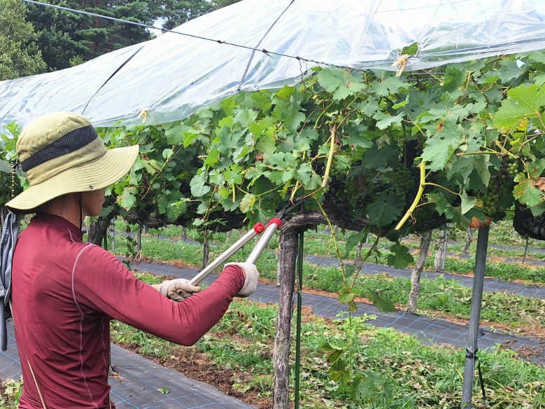 ブドウ畑でも、ピノ・ノワール、メルロー、カベルネ・ソーヴィニヨンなどの黒ブドウ品種の色づきが進んでいます。この時期の大切な作業が、結果枝の剪定。不要な枝を切り揃えることで、大元の枝に既にできている来年の花芽へ養分を届けてあげることがポイント。かつ、今実っているブドウの房にも十分に養分が届くように、必要な葉は残す必要があるそうで、ここでも農業の奥深さを感じます。