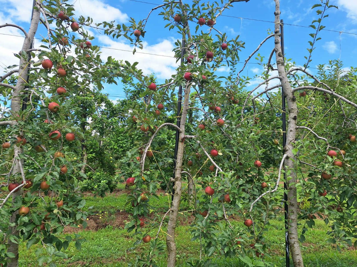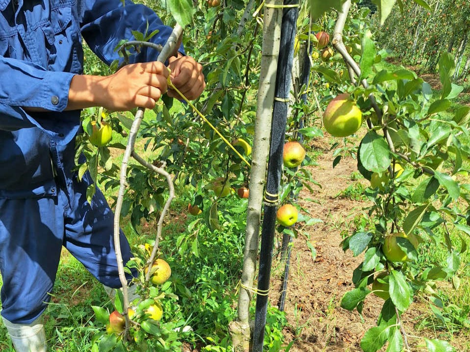 りんご畑では、7月いっぱいまでかかった摘果作業を終え、8月半ばを過ぎた頃から紅玉が少しずつ赤みを帯びてきました。このまま順調に大きく、おいしく育つことを祈りながら、今年実りが少なかった樹々のケアを行っています。その一つが、枝を下向きに固定する下垂誘引。これはアンデルセンファームで行っている「新わい化栽培」という栽培方法において大切な作業で、樹勢を落ち着かせることで、来年の花芽をつきやすくするのが目的です。樹液が活発に動いている夏場は枝が曲がりやすく、誘引によって枝の重なりを解消することで、太陽の光が満遍なく浴びられるようにもなります。収穫が終わる頃には枝が固まり、誘引している紐を切除しても枝が下がったままの円筒形の樹勢になったら下垂の完成です。