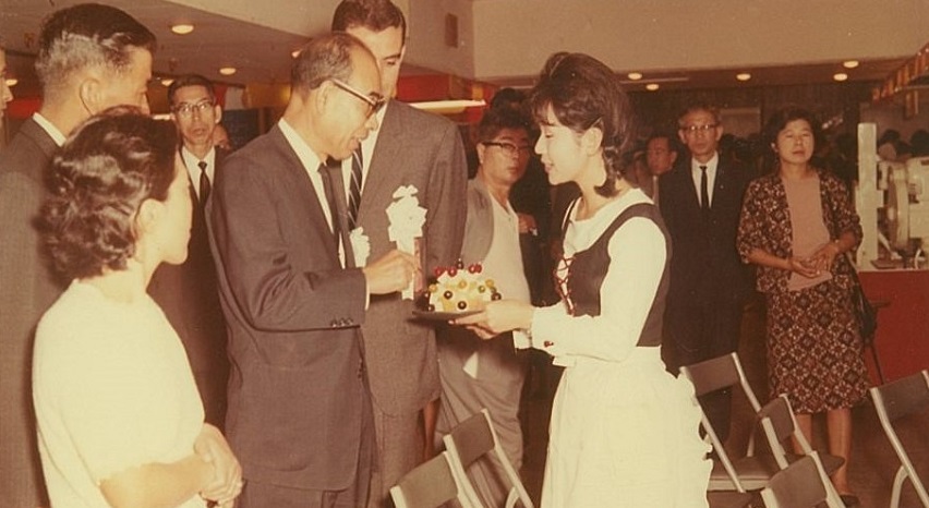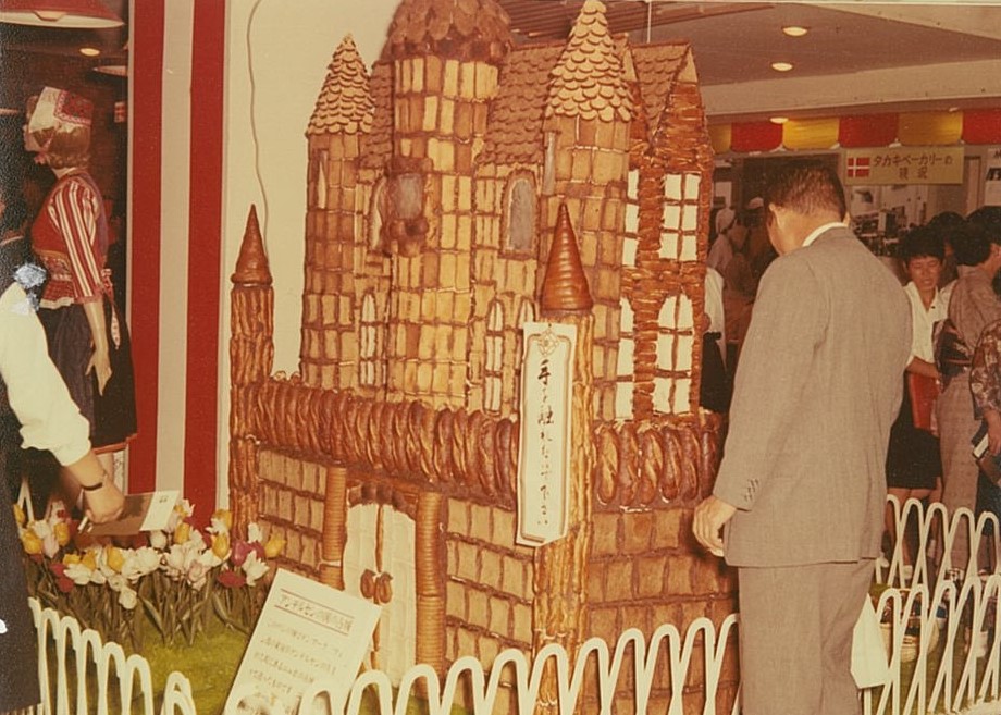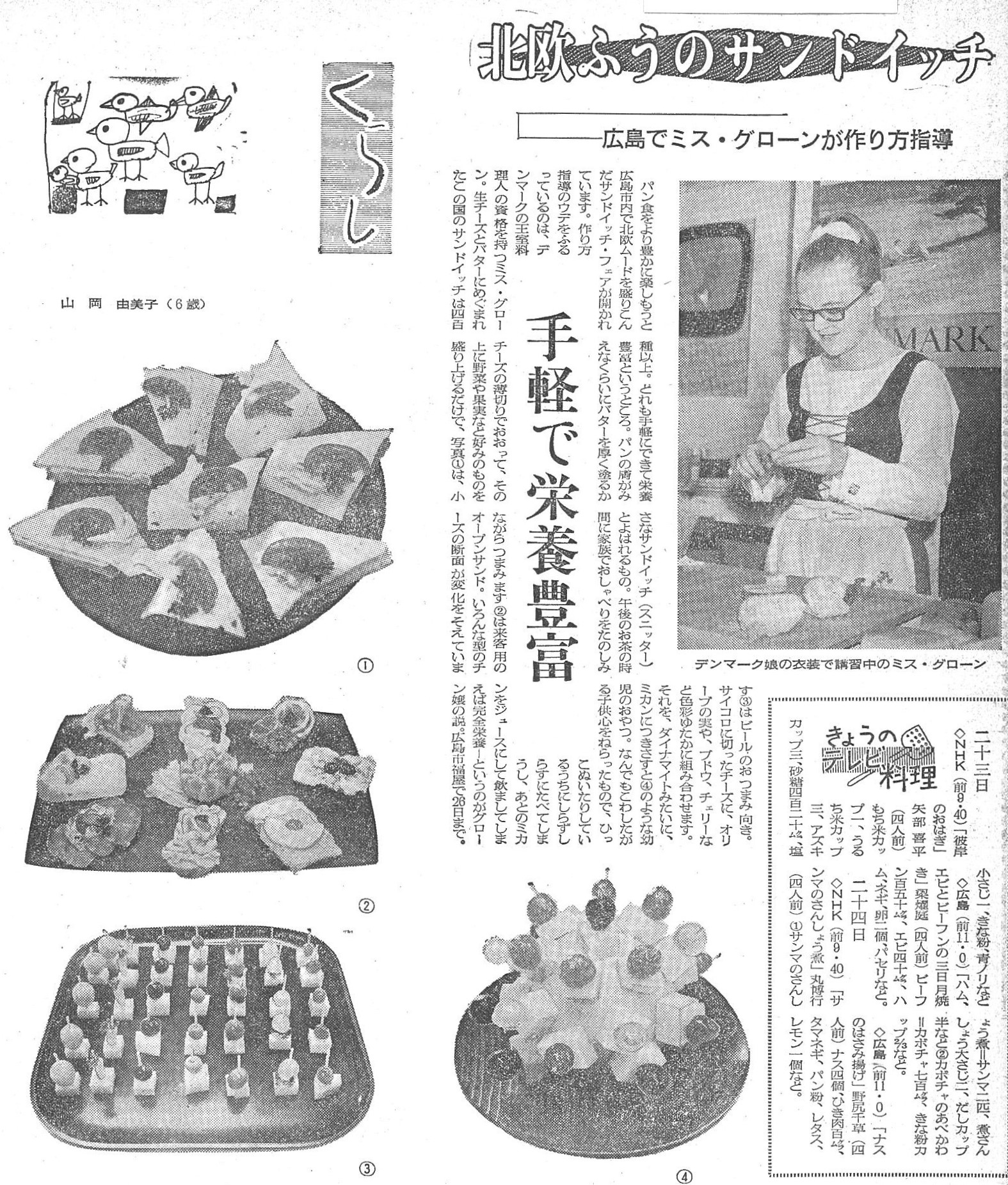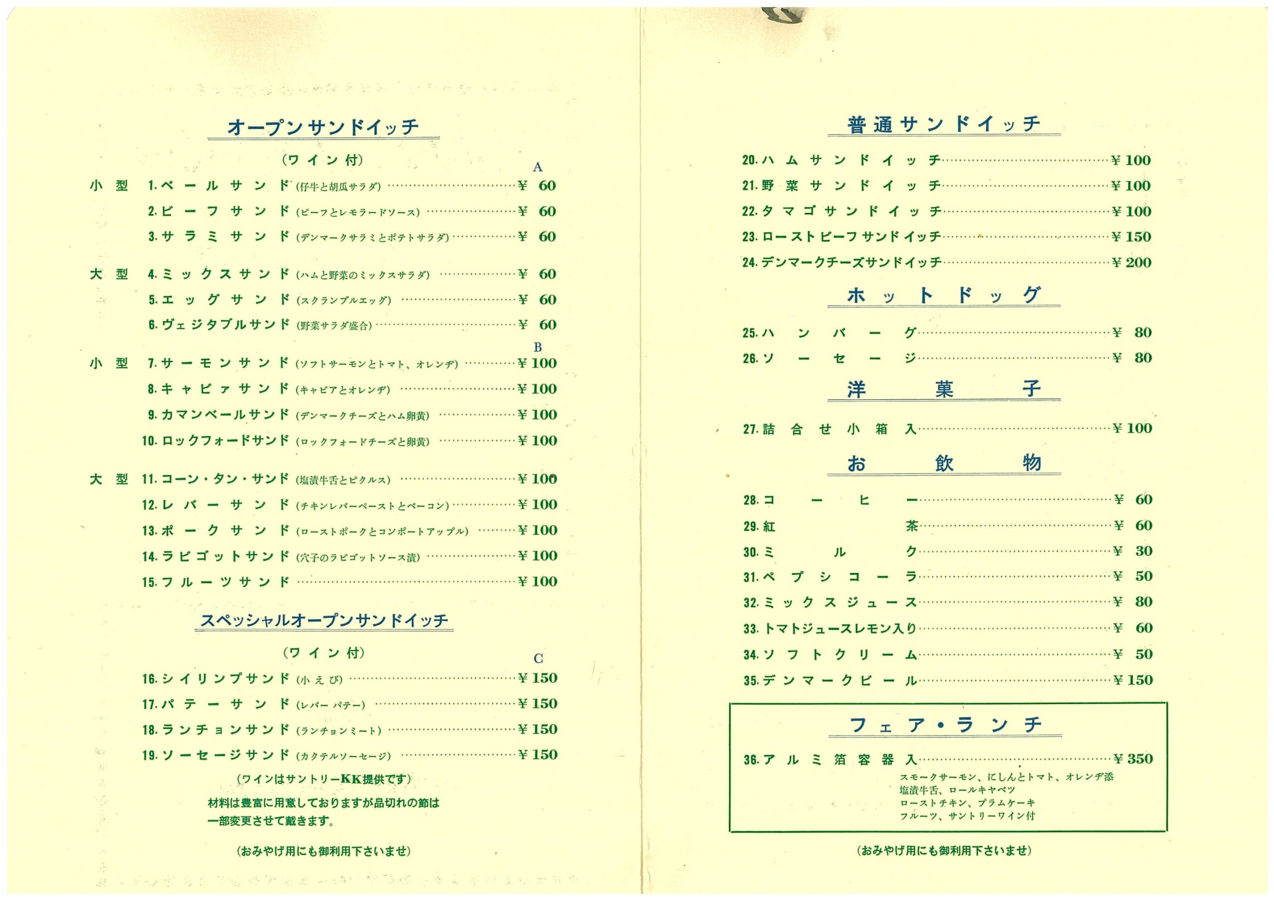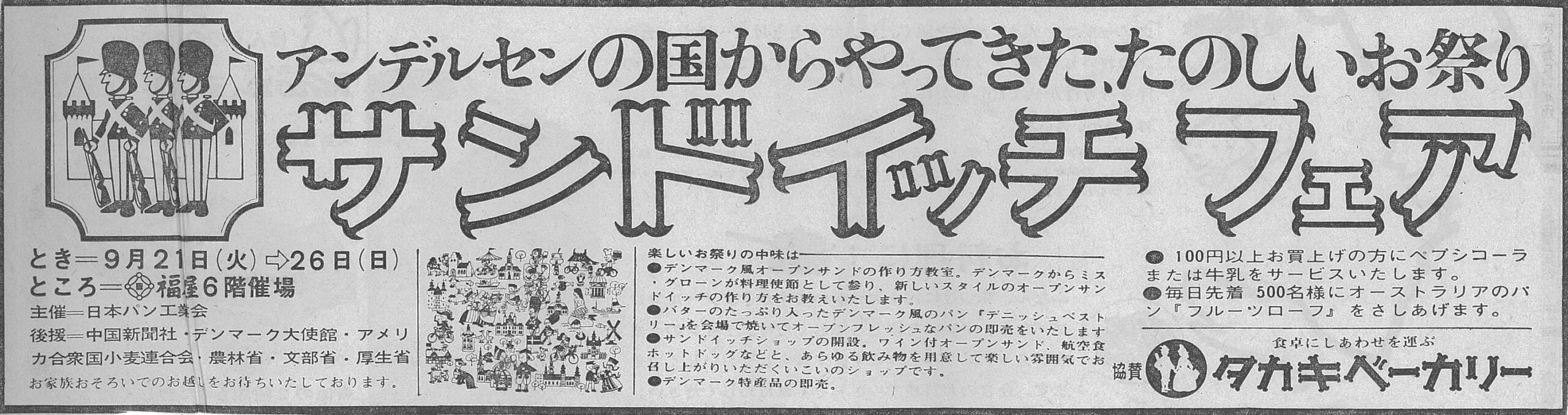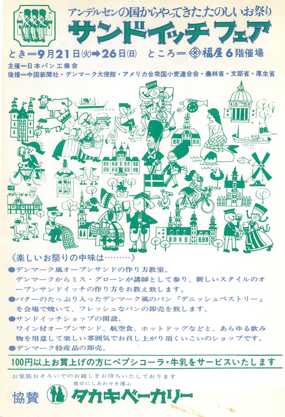1963年5月に「世界のパン展」を福屋百貨店様で開催し、たいへん好評を博しました。今回の「サンドイッチフェア」はお客様にパンのおいしい食べ方、新しい食べ方のご紹介をすることが目的でした。デンマークより王室料理人の資格を持つグローンさんにお越しいただき、オープンサンドイッチの講習会及びデモンストレーションにより、多くのお客様に新しい体験をしていただきました。また、創業者 高木俊介が訪欧し、研究開発の結果生まれた冷凍製法によるデニッシュペストリーの新発売などを含む大掛かりなものでした。