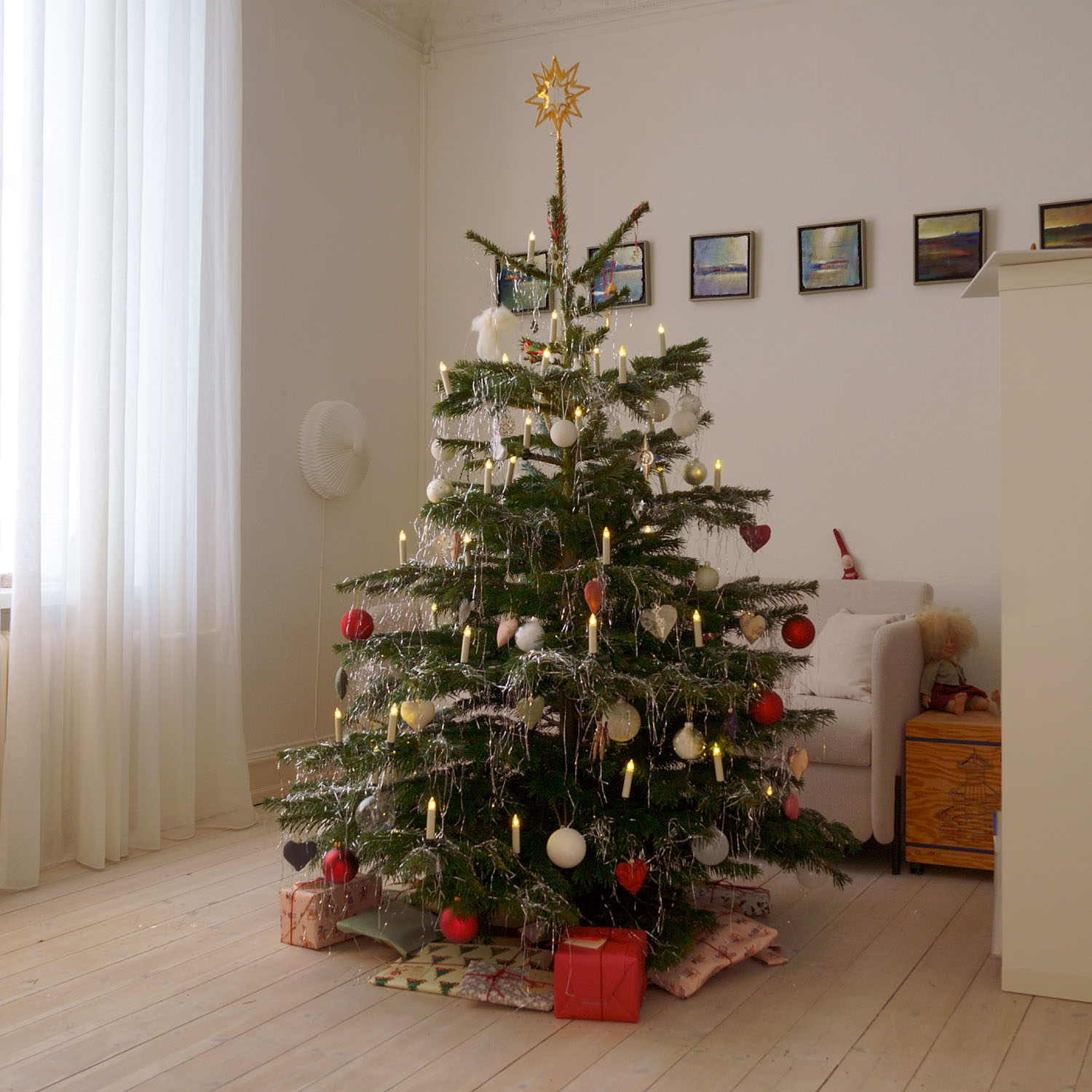 デンマークでのクリスマスイヴは、家族や親族が集まり夕方から深夜まで和やかに祝います。居間に飾られたクリスマスツリーの元には、晩餐を囲む人それぞれへのプレゼントが所狭しと並びます。クリスマスイヴの祝膳を3時間以上かけて楽しむ習慣、晩餐の後、皆で手をつないでキャンドルを点灯させたクリスマスツリーの周りをぐるっと囲んで歩きながら讃美歌を歌う習慣、プレゼントは一つずつ開けて皆で楽しむ習慣、など、待ち侘びたクリスマスの到来を祝う行事は、今もさまざまな形で受け継がれています。
