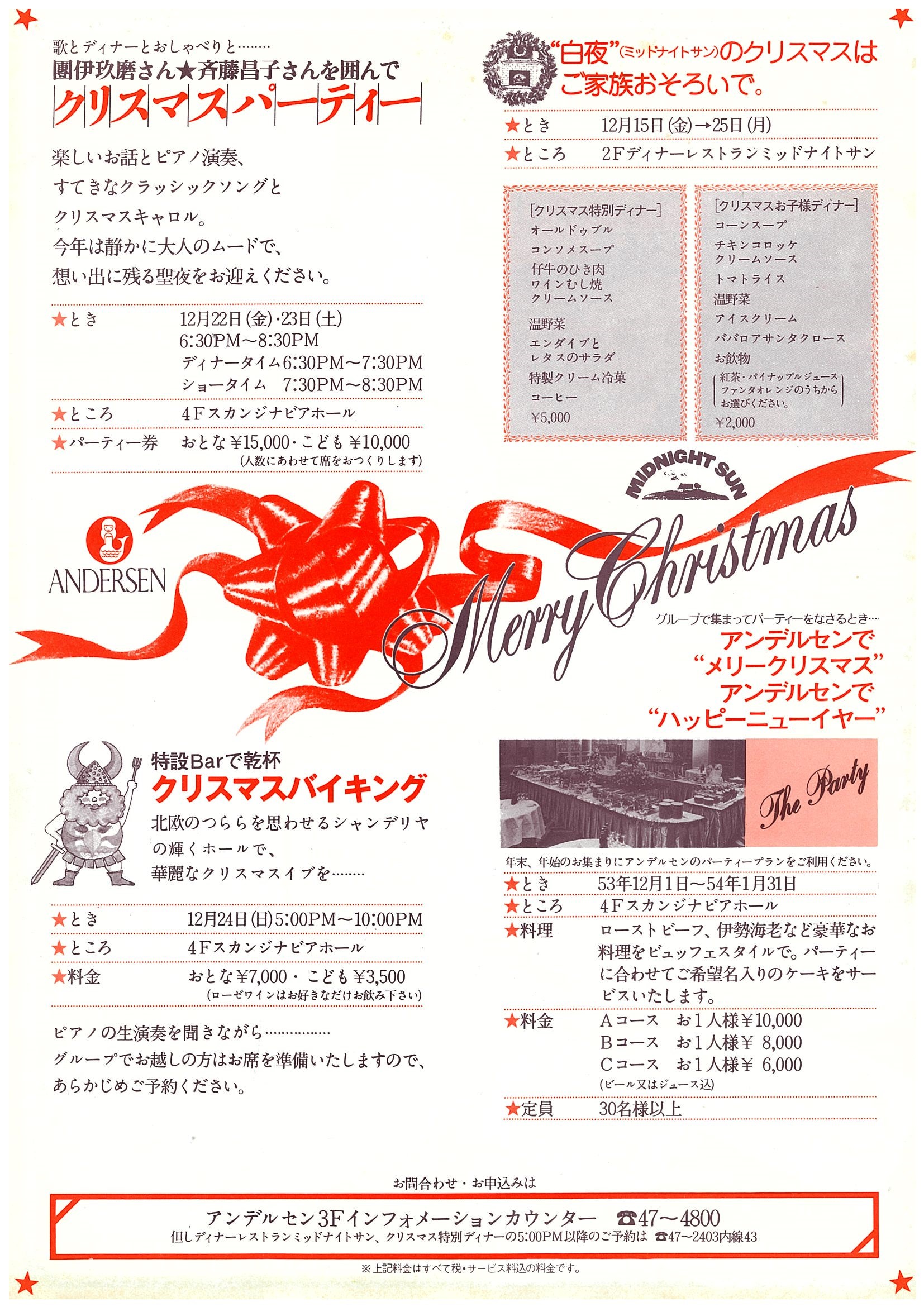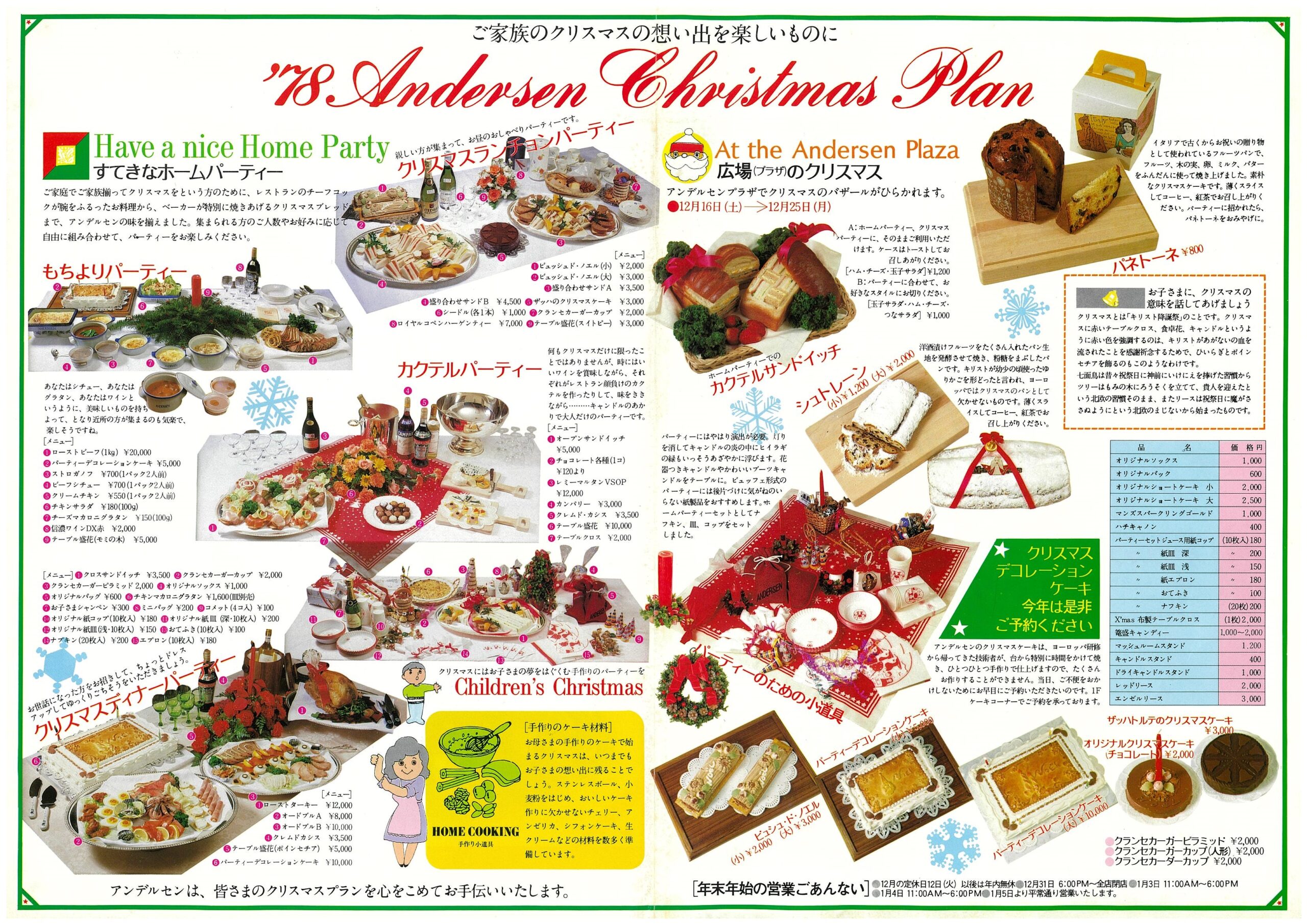 「ご家庭でご家族揃ってクリスマスをという方のために、レストランのチーフコックが腕をふるったお料理から、ベーカーが特別に焼きあげるクリスマスのパンまで、広島アンデルセンの味を揃えました。集まられるかたのお人数やお好みに応じて自由に組み合わせて、お楽しみいただけます。」<上記リーフレットより>
