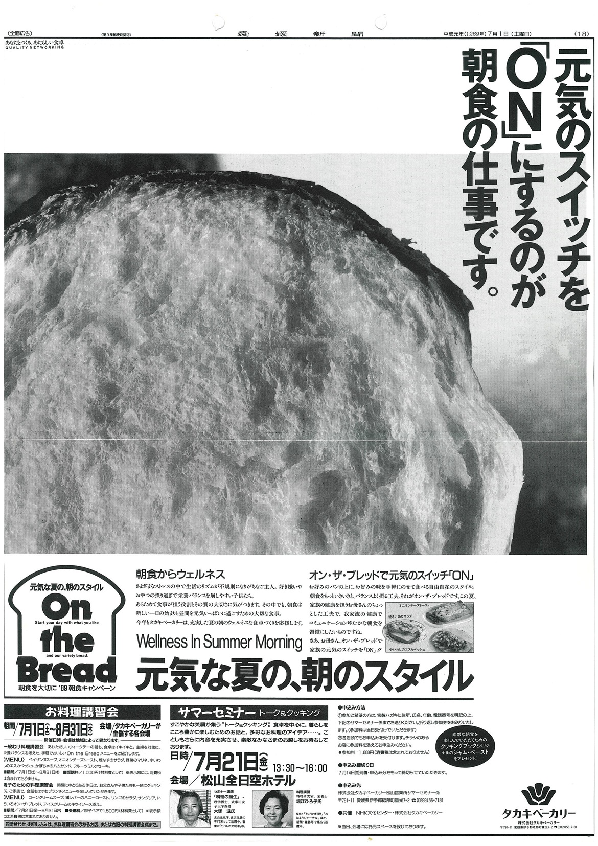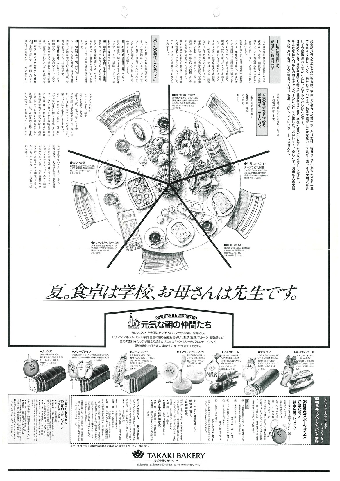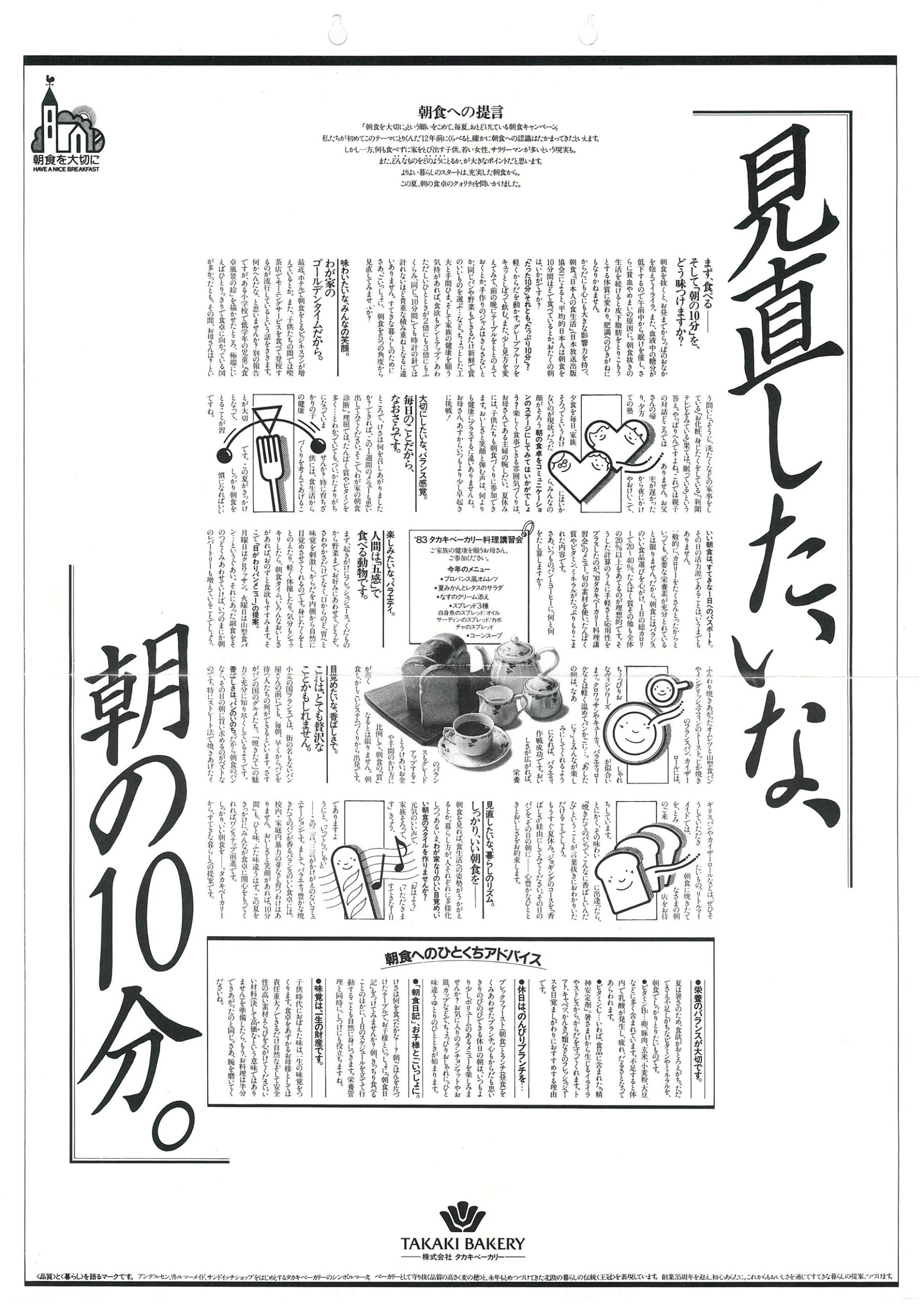 朝食ぬきの学童やビジネスマンが社会問題化していた頃、「朝食を大切に」のキャッチフレーズのもと、人々の忘れかけている“朝のさわやかさ”“朝食の大切さ”をアピール。と同時に、タカキベーカリーの提案する生活を伝えました。第1回は、「味のレパートリーを広げよう」をテーマに、料理講習会と文化講演会を中心に展開しました。