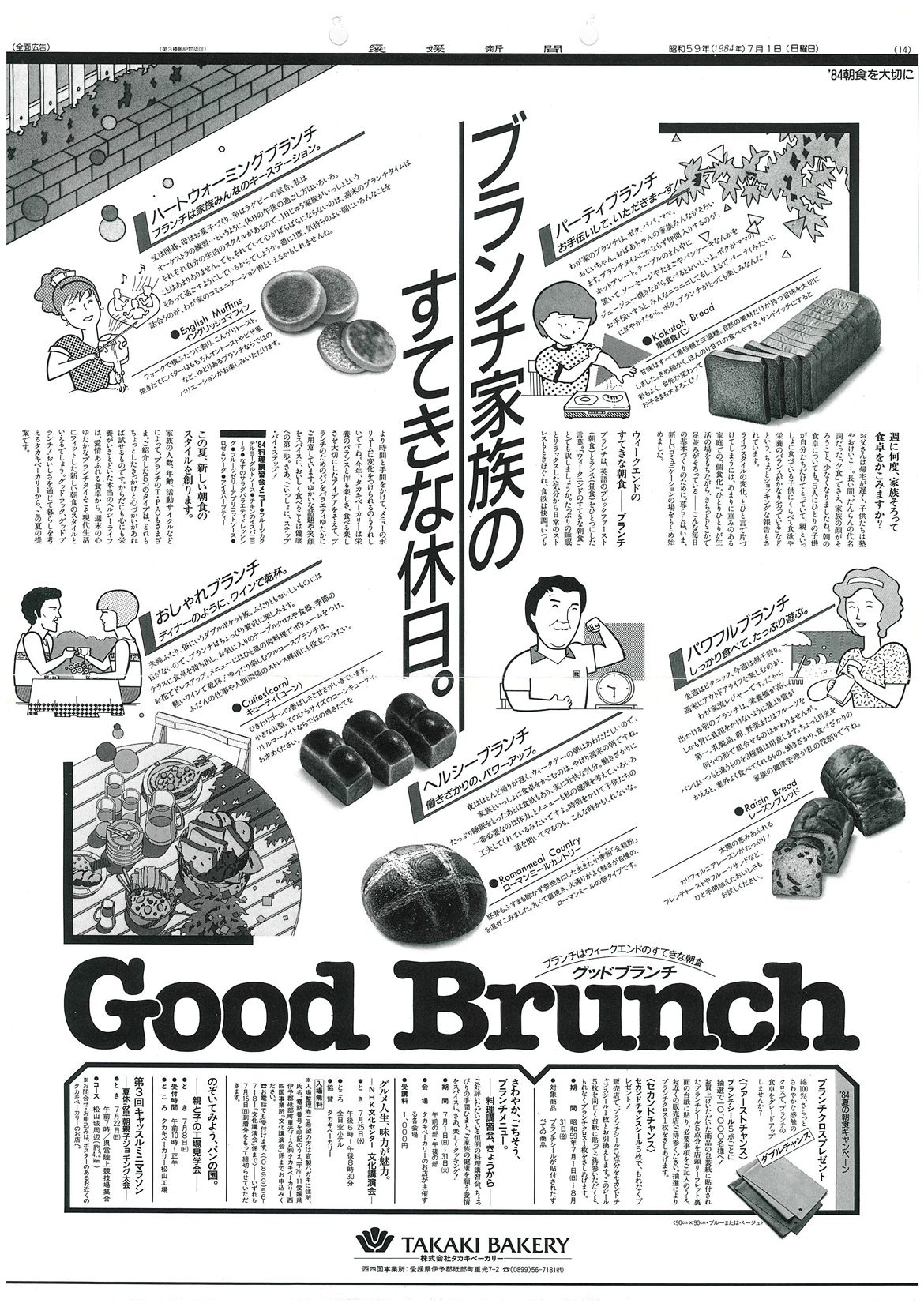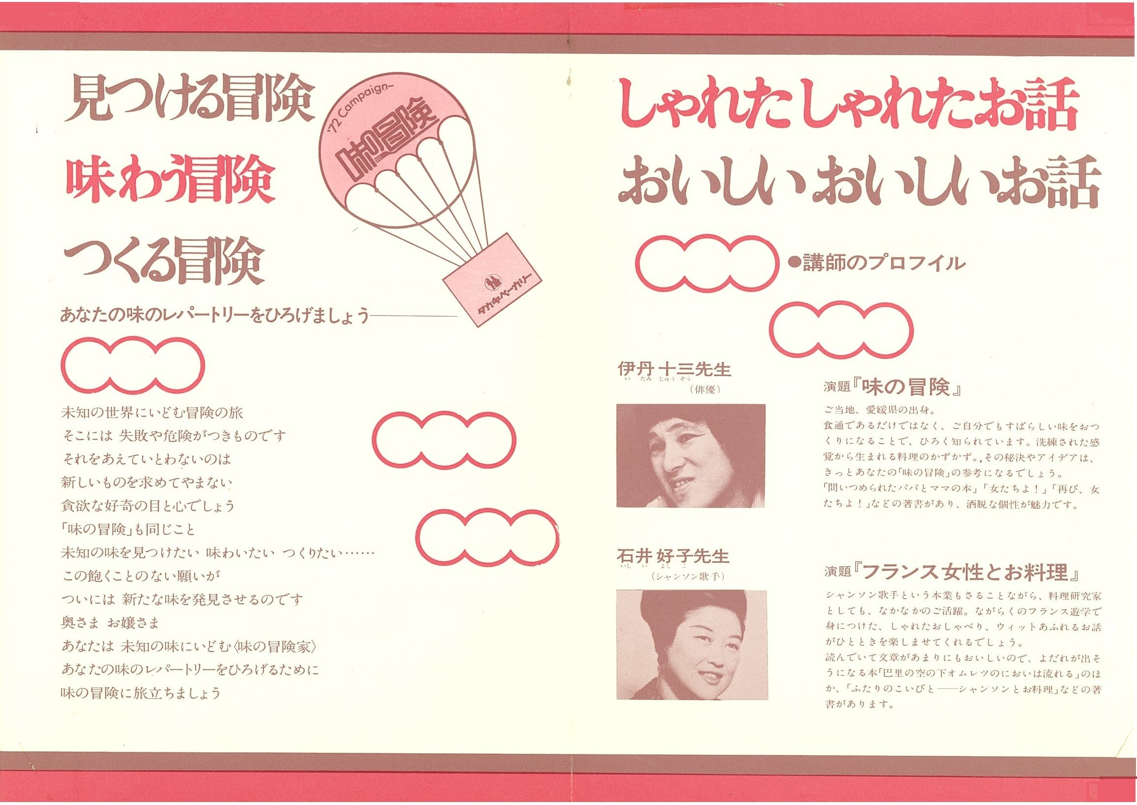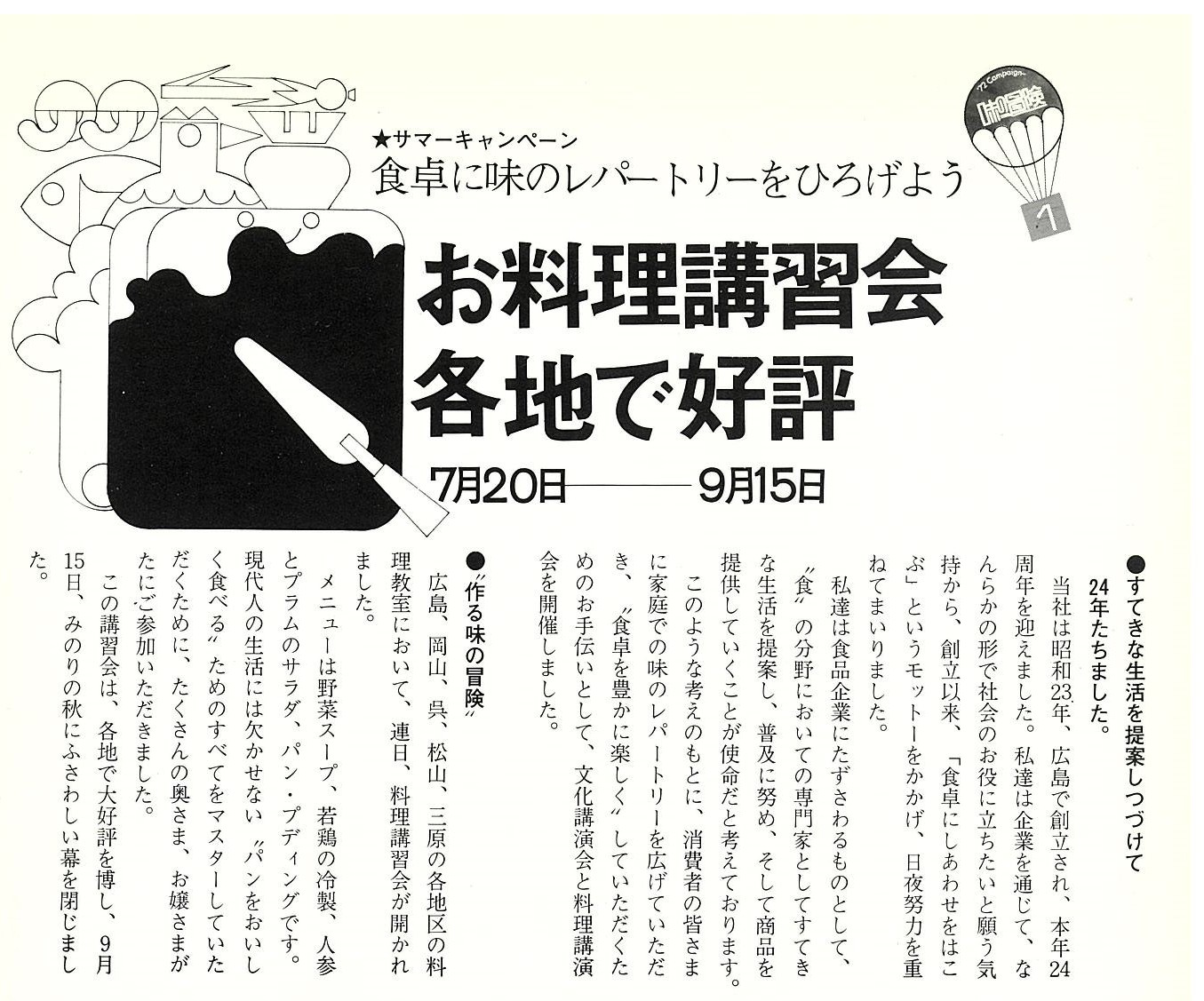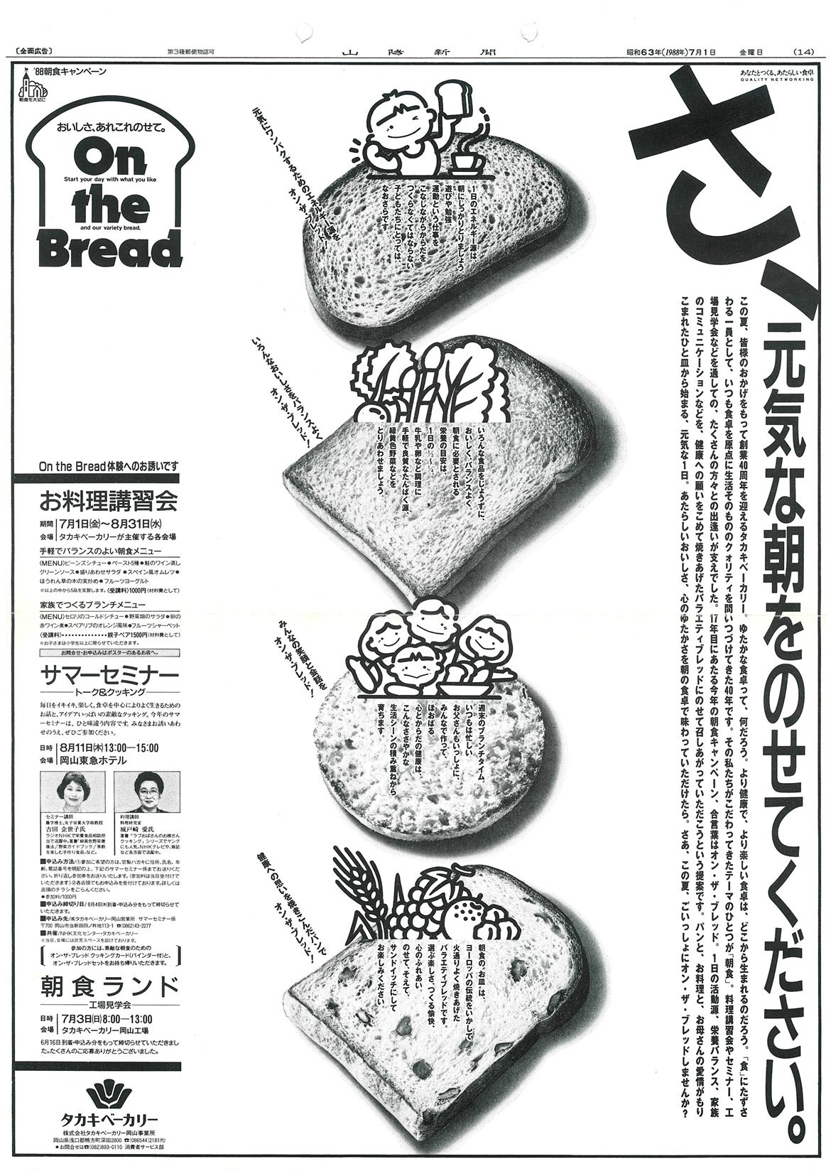 朝食ぬきの学童やビジネスマンが社会問題化していた頃、「朝食を大切に」のキャッチフレーズのもと、人々の忘れかけている“朝のさわやかさ”“朝食の大切さ”をアピール。と同時に、タカキベーカリーの提案する生活を伝えました。第1回は、「味のレパートリーを広げよう」をテーマに、料理講習会と文化講演会を中心に展開しました。