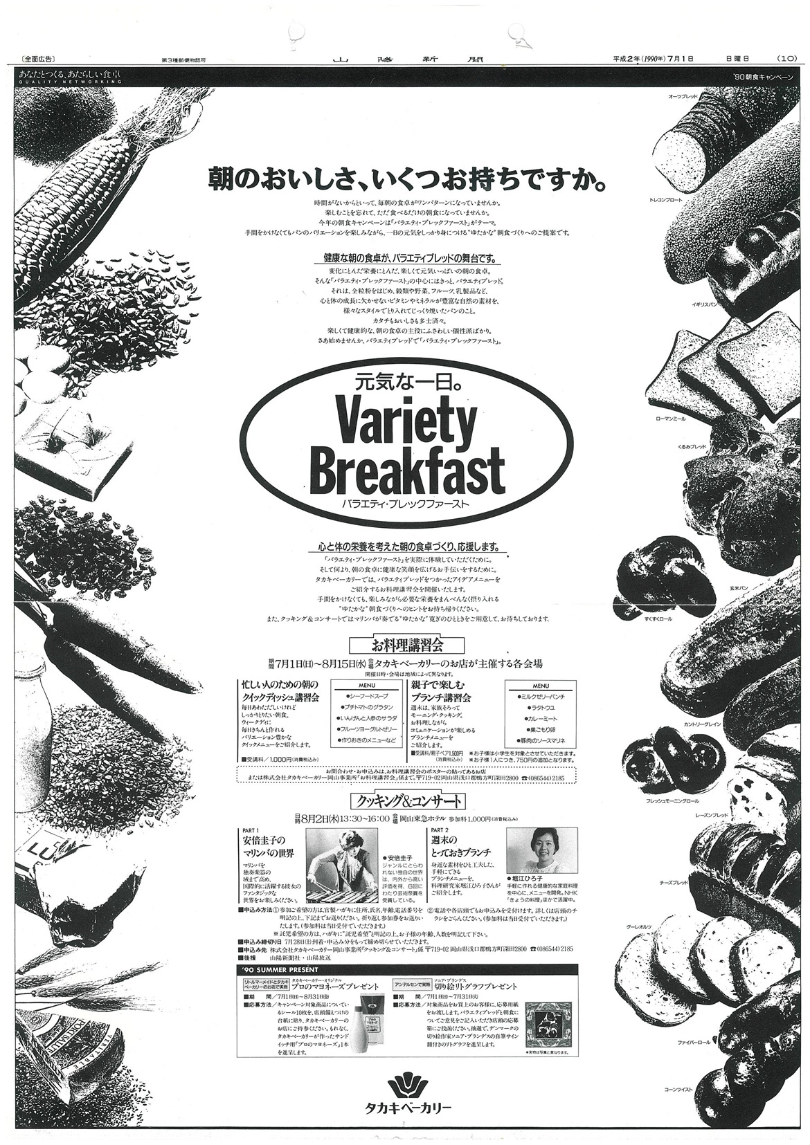 変化にとんだ栄養にとんだ、楽しくて元気いっぱいの朝の食卓。そんな「バラエティ・ブレックファースト」の中心にはきっと、バラエティブレッド。それは、全粒粉をはじめ、穀類や野菜、フルーツ、乳製品など、心と体の成長に欠かせないビタミンやミネラルが豊富な自然の素材を、様々なスタイルでとり入れてじっくり焼いたパンのこと。カタチもおいしさも多士済々。楽しくて健康的な、朝の食卓の主役にふさわしい個性派ばかり。さあ始めませんか、バラエティブレッドで「バラエティ・ブレックファースト」【1990年新聞広告より】