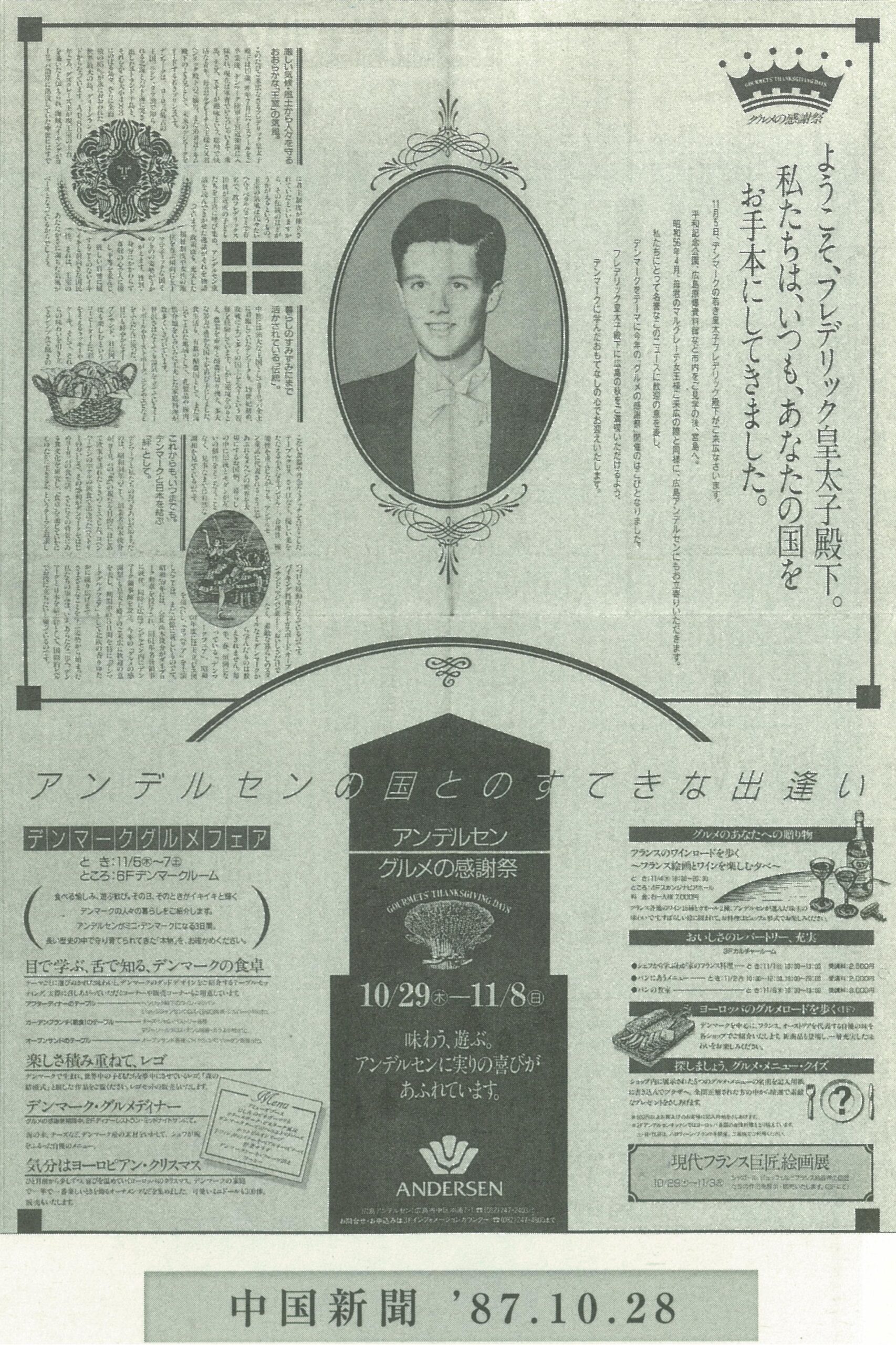 1987年11月5日、6日、デンマーク王国フレデリック皇太子が、広島アンデルセンへご来店になりました。これは「北欧」「デンマーク」を企業のアイデンティティとし、同国のよき伝統を紹介することに積極的に努めてきた当社にとって、たいへん喜ばしく、名誉あることでした。