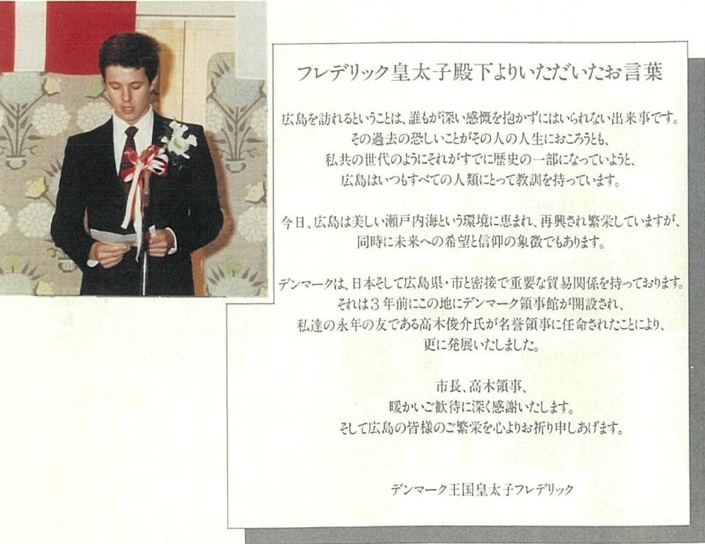 殿下は広島ご滞在中、広島アンデルセンで開催中の<1987グルメの感謝祭>の中心的催し、“デンマークグルメフェア”のテープカットをされたほか、デンマーク王国広島名誉領事である高木俊介会長の主催する歓迎パーティにご出席。荒木広島市長をはじめ地元財界の方々との友好を深められました。