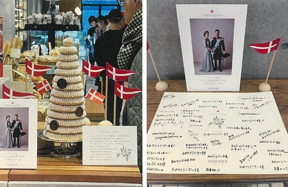 2024年1月14日、フレデリック10世国王陛下即位を祝して、広島アンデルセンではデンマークのお祝いのお菓子「クランセケー」をおつくりし、お客様からも祝福のメッセージを頂戴しました。