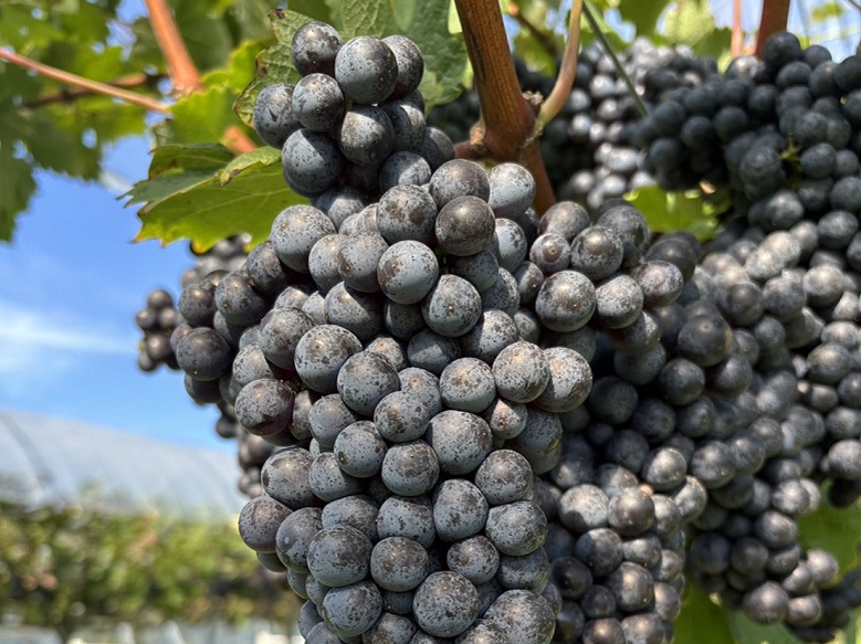 ぶどうは順調で収穫量は前年を上回りました。主な品種はピノ・ノワール、シャルドネ、ソーヴィニヨン・ブラン、メルローで、カベルネ・ソーヴィニヨンは10月20日から収穫を開始しました。収穫後の列から雨除けシートを外し、通路に鶏糞を散布して土づくりを進め、少しずつ冬支度を整えています。