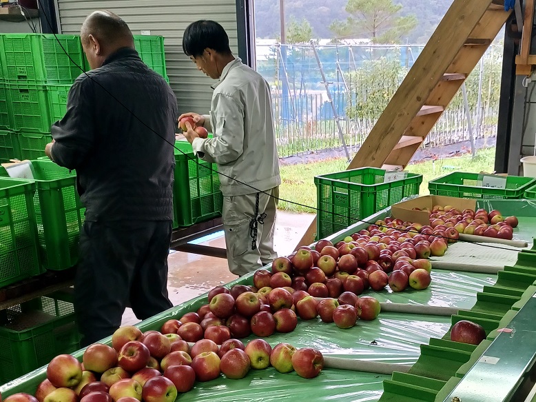 りんごは、紅玉の収穫・選果を10月初旬に終えました。梅雨期の少雨と猛暑で小玉傾向が目立ち、高温による日焼けや落果も多く、収穫量は前年より少なくなりました。シナノゴールドの収穫は10月下旬から、グラニースミスは11月中旬から収穫予定です。今年は夜温が高く夜蛾の活動が活発で、特にシナノゴールドで吸汁被害による腐敗が多発したため、来季は防蛾灯・防虫灯を設置し、安定した結実と収穫を目指します。