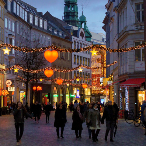 11月に入ると街並みもクリスマス仕様になります。夕方は4時前後には暗くなるので、夕方以降、建物に飾られた灯りはひときわ美しく感じられます。ベーカリーやケーキ屋さんにはクリスマスクッキーが並び、お店のレジには「胡椒粒」と呼ばれる一口サイズのまんまるクッキーを入れたボウルが置かれます。また、街頭やカフェでは「グルッグ」と呼ばれるスパイス風味のホットワインや、たこ焼きより少し大きいまんまるワッフル「エーブルスキーバ」がお目見えします。街頭で売られるアーモンドの砂糖がけもスパイス入り。湿った気候になりがちな11月には、スパイスの香りがあちこちで漂います。