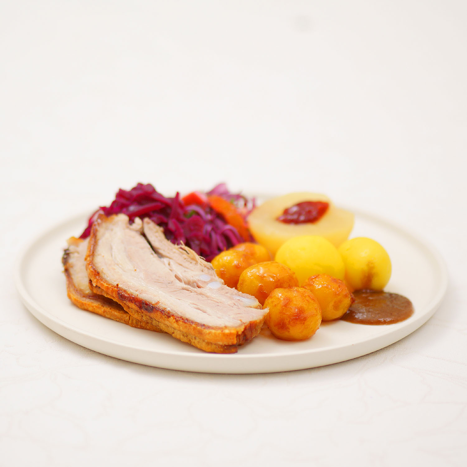 我が家でのクリスマス・イヴの晩餐を飾るのもフレスケスタイです。紫キャベツの甘酢煮と茹でじゃがいも、キャラメルポテト、半割りんごのコンポート、グレービーソースを添えます。25日・26日はクリスマスの祝日なので、いずれかの日の午後1時から親族でスメアブロ尽くしの午餐を開く家庭が多くみられます。10種類以上のスメアブロが楽しめるように数々の品を用意するのですが、焼きたてのフレスケスタイは終盤に登場する一品で、間違いなく歓声が上がります。フレスケスタイのスメアブロは、デンマークのライ麦パン「ロブロ」を合わせるのが鉄則ですが、スメアブロ・レストランでもクリスマス前の一品として人気を誇ります。