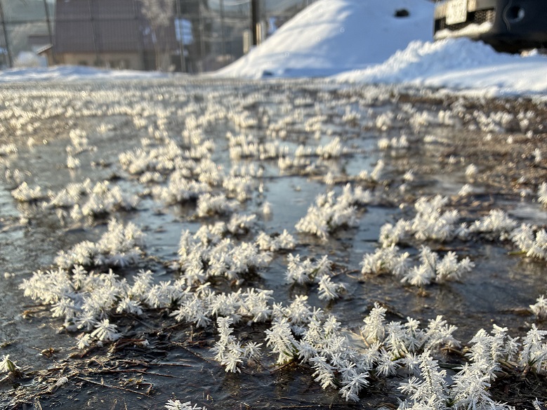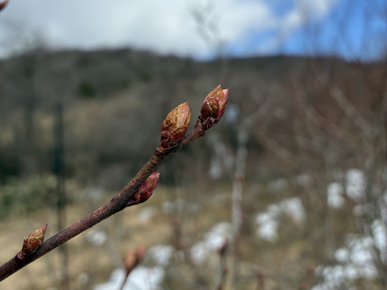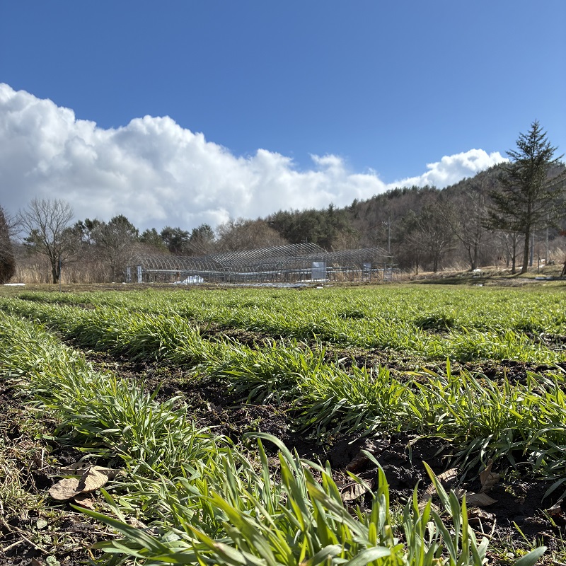 芸北100年農場の冬は例年、積雪と厳しい寒さに見舞われますが、今年は暖かく、雪が降ってもすぐに解けていきました。このまま春を迎えるかと思いきや、3月にはまた雪が降り、季節が行きつ戻りつするような日々となりました。農場の麦は、雪解けのたびに顔をのぞかせては再び雪に埋もれながらもたくましく育っています。春を告げる蕗の薹(ふきのとう)も顔を出し、ブルーベリーも芽吹いています。農場には、例年より1か月早く春が訪れました。